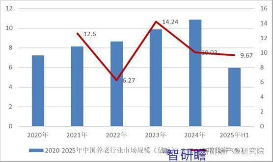据智研瞻产业研究院统计显示,2020年中国养老行业市场规模7.22亿元,2024年中国养老行业市场规模10.86亿元,同比增长10.03%。2020-2025年中国养老行业市场规模如下: