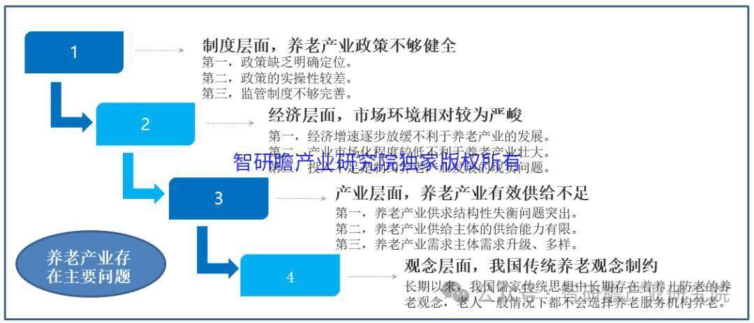 一是养老产业供需结构性失衡突出。养老产业供给相对不足。中国 中国的老龄化人口正在迅速增加,未来将会有更多的养老需求。养老产业布局也不合理,城乡差距大。二是养老产业供给主体的供给能力有限。目前,中国 我国养老产业市场仍处于探索阶段,尚未形成高质量、精准的产品供给。养老产业的内容主要以餐饮为主、护理、医疗保健等基本养老服务,难以满足更高层次的养老需求。第三,养老产业主体需求有待升级、多样。目前老年人的养老需求不仅仅是满足物质需求,还包括医疗精神慰藉等方面,尤其是中高端养老。此外,中国 美国老龄化人口也呈现空巢状态、高龄化、失能化、贫困和其他复杂特征,多样化、多元化的养老需求激增。