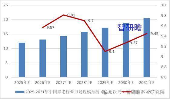 智研瞻产业研究院预测,2025-2031年中国养老行业市场规模增长率在9%左右,2031年中国养老行业市场规模20.51亿元,同比增长9.45%。2025-2031年中国养老行业市场规模预测如下: